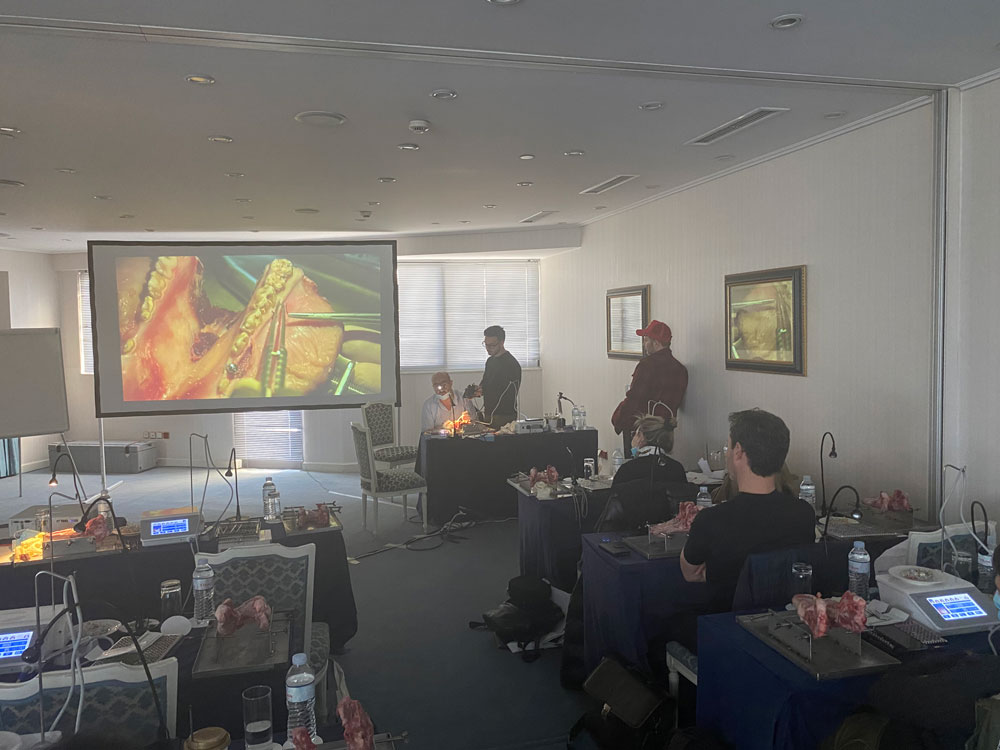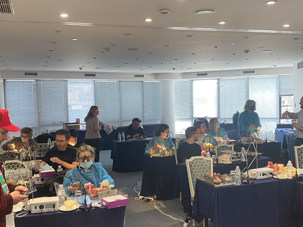 Το απόγευμα της 2ης ημέρας πραγματοποιήθηκε το πρακτικό μέρος του σεμιναρίου, όπου ο κ. Διακενισάκης έκανε επίδειξη τοποθέτησης εμφυτεύματος σε γνάθο από αγριόχοιρο που έφερε μαζί του από την Κρήτη, στην οποία είχε κάνει CBCT και εκτύπωσε νάρθηκα για την guided τοποθέτηση εμφυτεύματος. Ακόμα έδειξε τη λήψη μοσχεύματος συνδετικού ιστού και πραγματοποίησε έναν τραπεζοειδή μυλικά μετατοπιζόμενο κρημνό στον οποίο έραψε το μόσχευμα για να καλύψει υφίζηση σε υπάρχοντα δόντια. Στη συνέχεια χρησιμοποίησε την ίδια τεχνική για να καλύψει υφίζηση σε εμφύτευμα. Μετά την επίλυση των αποριών, οι συμμετέχοντες τοποθέτησαν από ένα εμφύτευμα σε γνάθους χοίρων. Στη συνέχεια δημιούργησαν μια υφίζηση παρειακά του εμφυτεύματος, έκαναν λήψη μοσχεύματος συνδετικού ιστού το οποίο αποεπιθηλιοποίησαν και εφάρμοσαν την τεχνική του τραπεζοειδούς μυλικά μετατοπιζόμενου κρημνού για να καλύψουν την υφίζηση.
