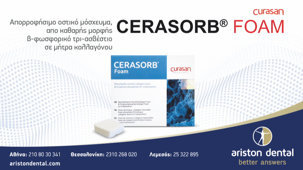 Η έξυπνη διαχείριση του µετεξακτικού φατνίου µε CERASORB® Foamπροσφέρει προφανή πλεονεκτήµατα. Η βελτιστοποιηµένη αντιµετώπιση που υποβοηθείται από αυτήν την καινοτόµο θεραπεία συµβάλλει στη διατήρηση της αισθητικής εικόνας και την ικανοποίηση του ασθενούς. Το οδοντιατρείο σας επωφελείται από την προκύπτουσα βελτίωση της εικόνας του ασθενούς. Ειδικότερα, η έξυπνη διαχείριση του µετεξακτικού φατνίου συµβάλλει επίσης, ως µία εύλογη βελτίωση µιας διαδικασίας ρουτίνας, στην οικονοµική επιτυχία του ιατρείου.