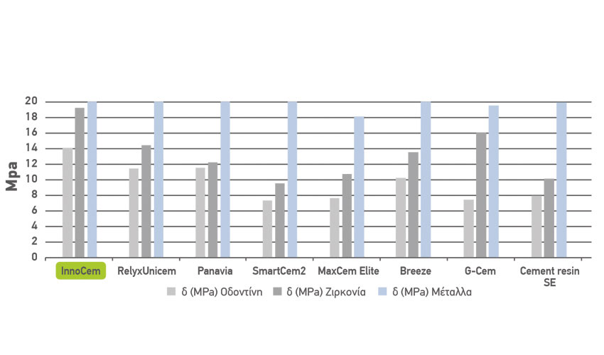 ▶στην οδοντίνη: 14,10 MPa. ▶στην ζιρκονία: 19,3 MPa. ▶στα µέταλλα: 23,81 Mpa.