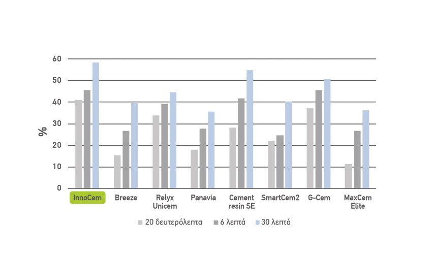- Καλή ισορροπία µεταξύ υδροφοβίας για µακροπρόθεσµη σταθερή συγκόλληση, και ελαφράς υδροφιλίας προ του πολυµερισµού, ώστε να επιτραπεί η χηµική συγκόλληση της InnoCemµε τις ίνες κολλαγόνου και τα φωσφορικά ιόντα όταν χρησιµοποιείται σε ζωτικά δόντια
