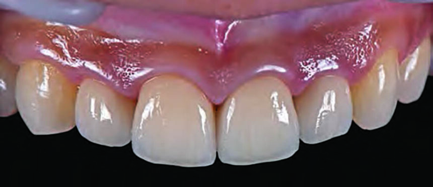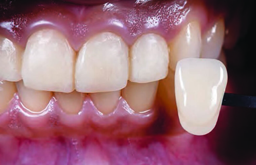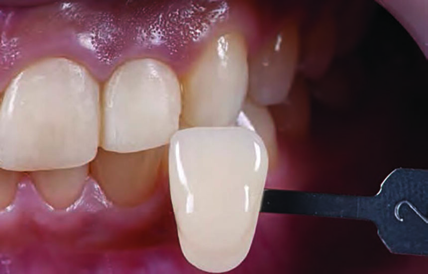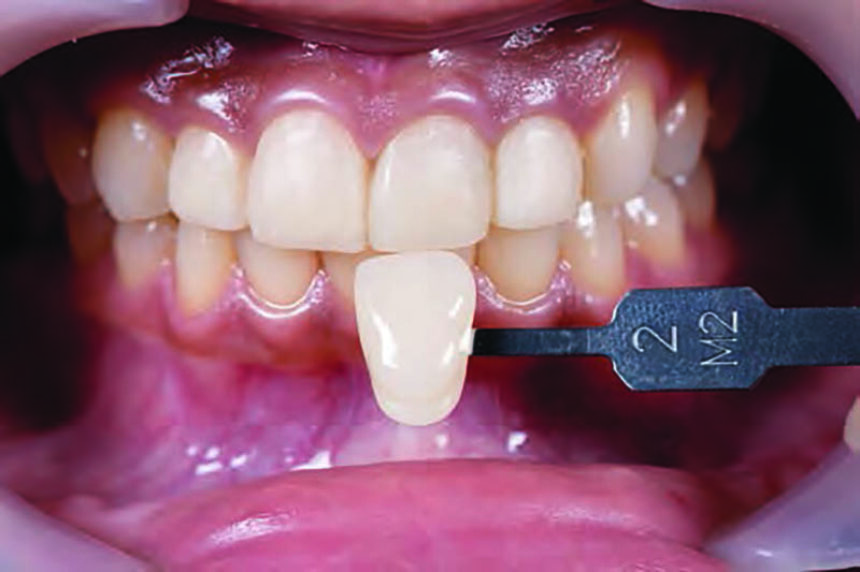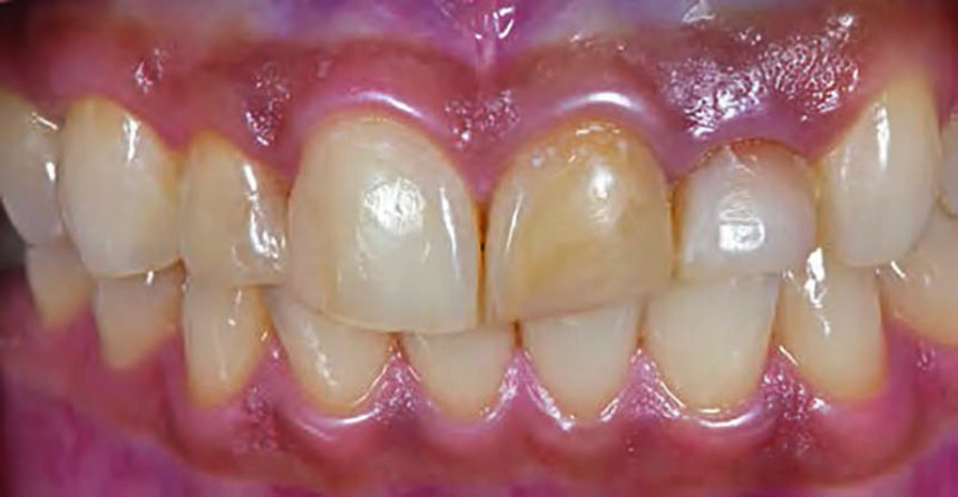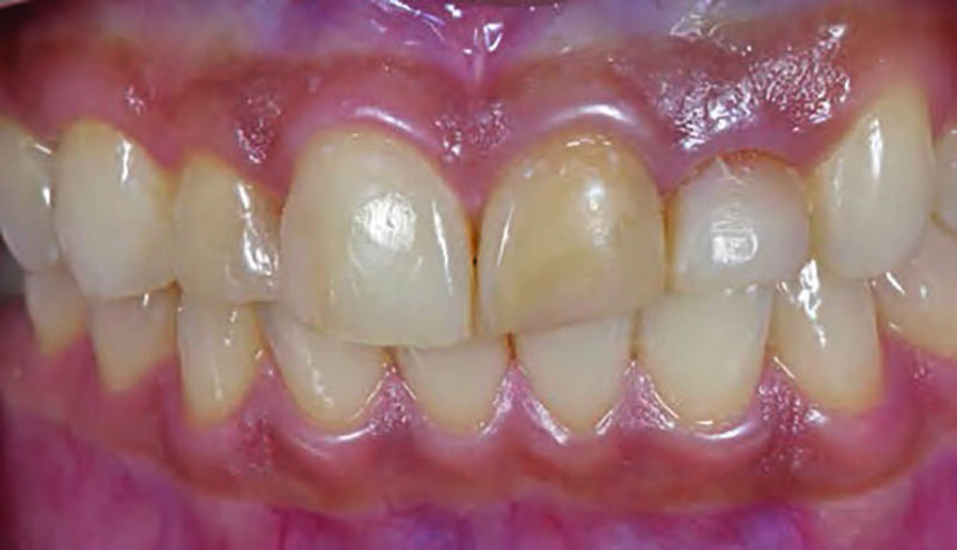 Ένας 53χρονος ασθενής προσήλθε στο ιατρείο μας με αισθητικούς οδοντιατρικούς προβληματισμούς. Κατά την κλινική εξέταση, παρατηρήθηκαν αποκαταστάσεις σύνθετης ρητίνης σε όλους τους άνω τομείς και ο 21 εμφάνιζε δυσχρωμία(εικ. 1). Τα κοπτικά άκρα ήταν ασύμμετρα και δεν εναρμονίζονταν με τη γραμμή του κάτω χείλους, και επειδή η μορφολογία δεν ακολουθούσε αυτή των φυσικών δοντιών, χρειάστηκαν ολοκεραμικές στεφάνες για να καταστεί το χαμόγελο του ασθενή πιο φυσικό. Η κλινική και ακτινογραφική εξέταση δεν αποκάλυψαν κάποια παθολογία.