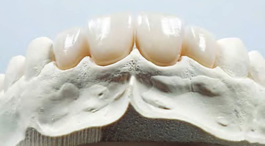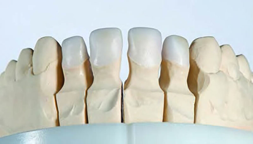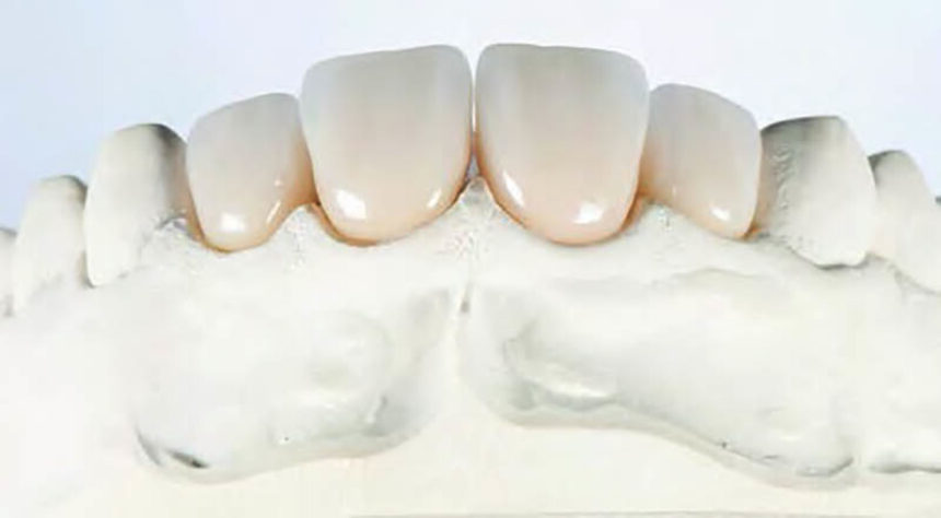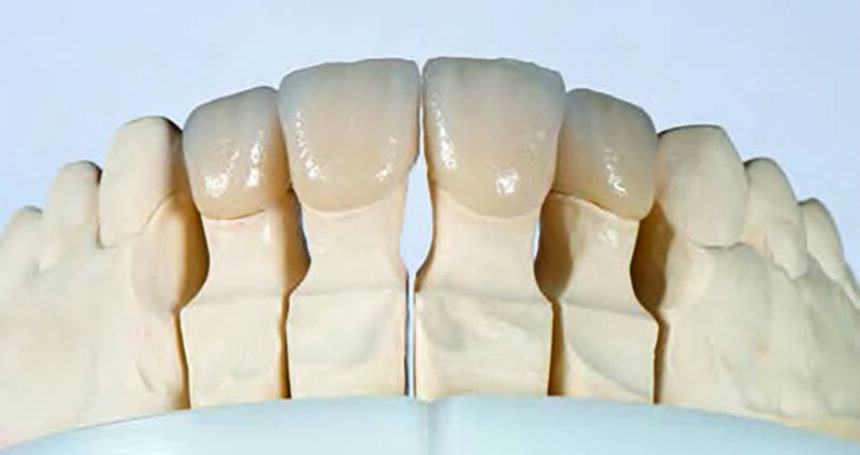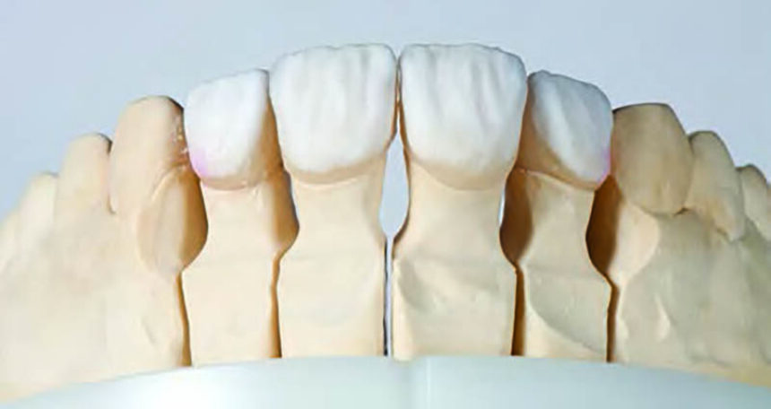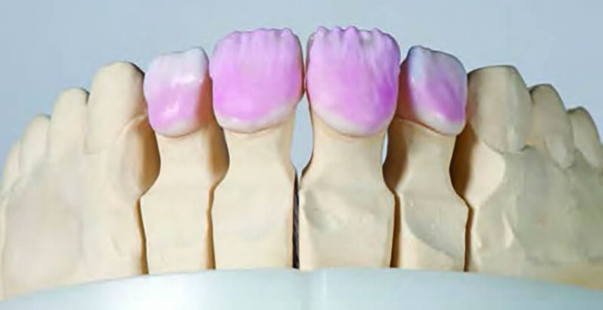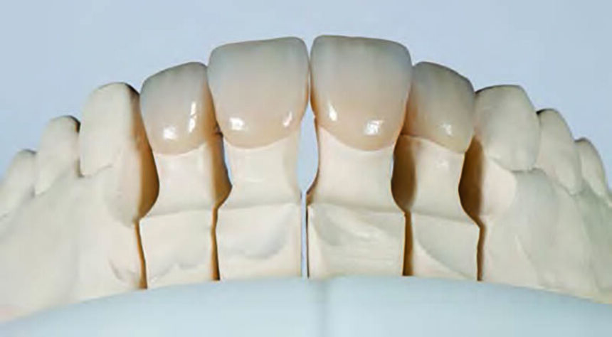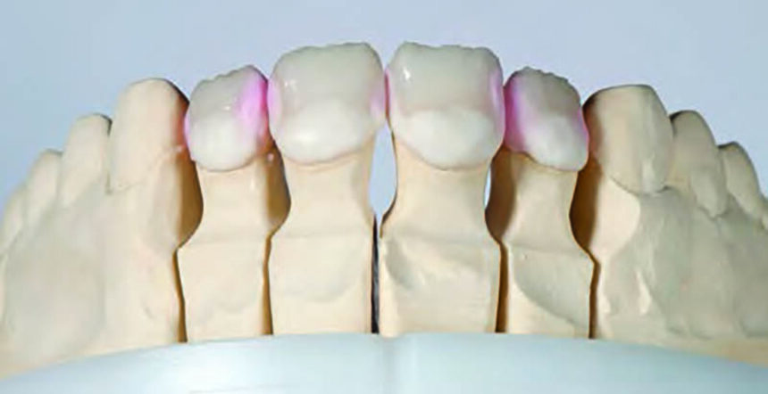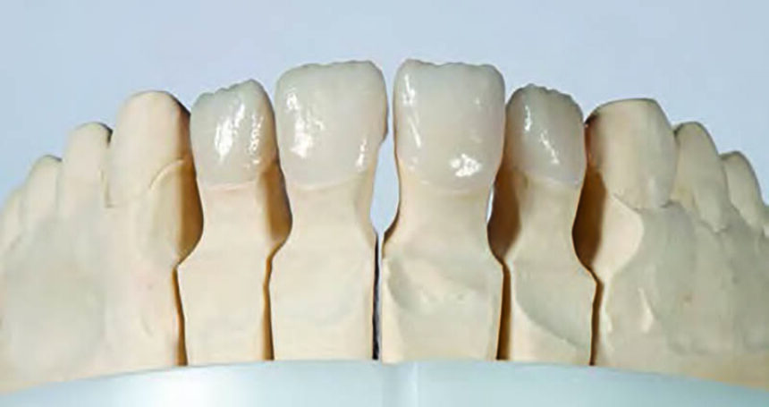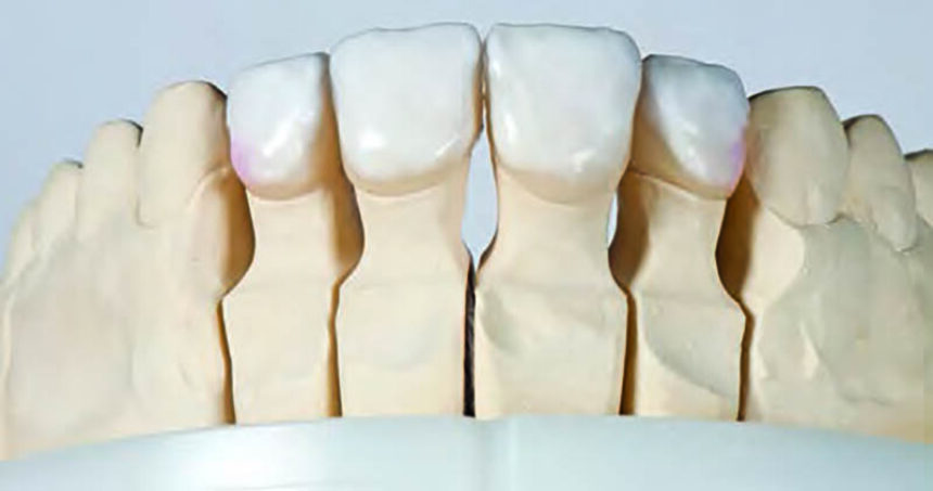 Το βασικό χρώμα καταγράφηκε χρησιμοποιώντας το χρωματικό οδηγό Vita Toothguide 3DMaster Shade Guide(εικ. 2-5). Στη συνέχεια, κατασκευάστηκαν σκελετοί από οξείδιο της ζιρκονίας Vita YZHT με μηχάνημα CAD/CAM και τοποθετήθηκαν στο εκμαγείο(εικ. 6). Επελέγη η πορσελάνη Vita VM9 ως κεραμικό σύστημα διαστρωμάτωσης λόγω της φυσικής απόχρωσης και φωτεινότητας. Κατασκευάστηκαν μήτρες σιλικόνης επάνω στο διαγνωστικό κέρωμα και στη συνέχεια μία από αυτές κόπηκε και μετατράπηκε σε κλειδί σιλικόνης. Αυτό το κλειδί χρησιμοποιήθηκε στη συνέχεια για να προσδιοριστούν τα όρια της διαστρωμάτωσης και να καθοριστεί το σχήμα των στεφανών(εικ. 7).