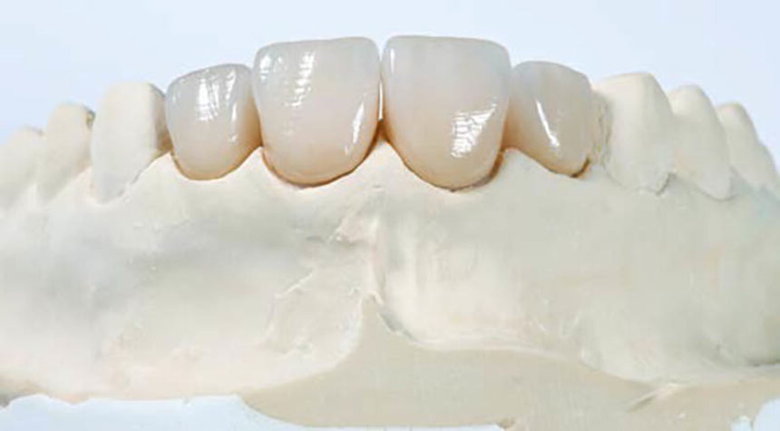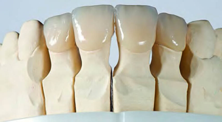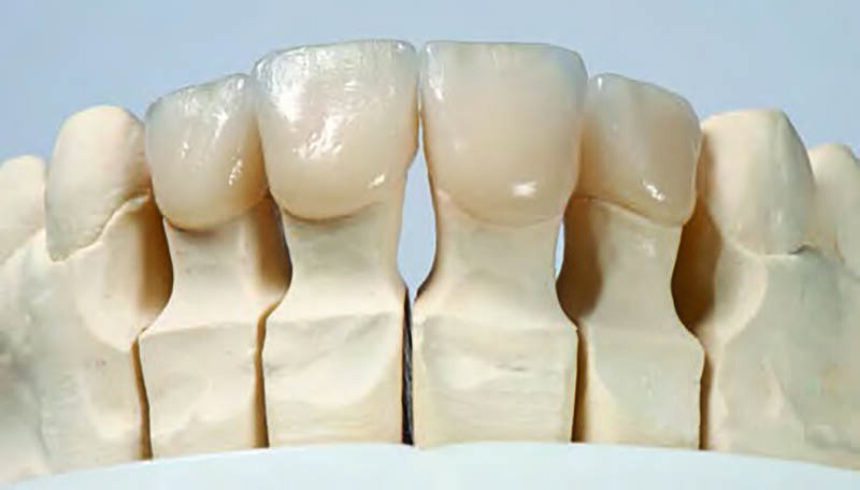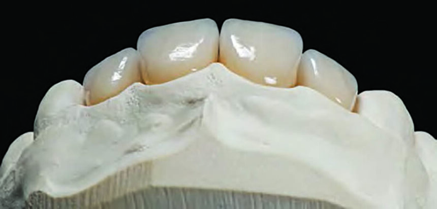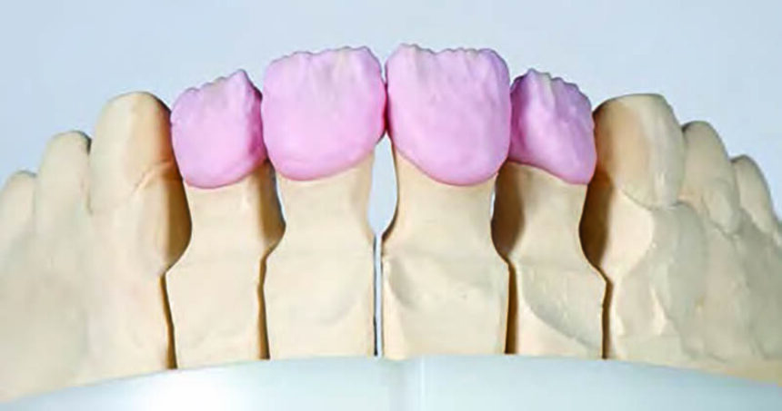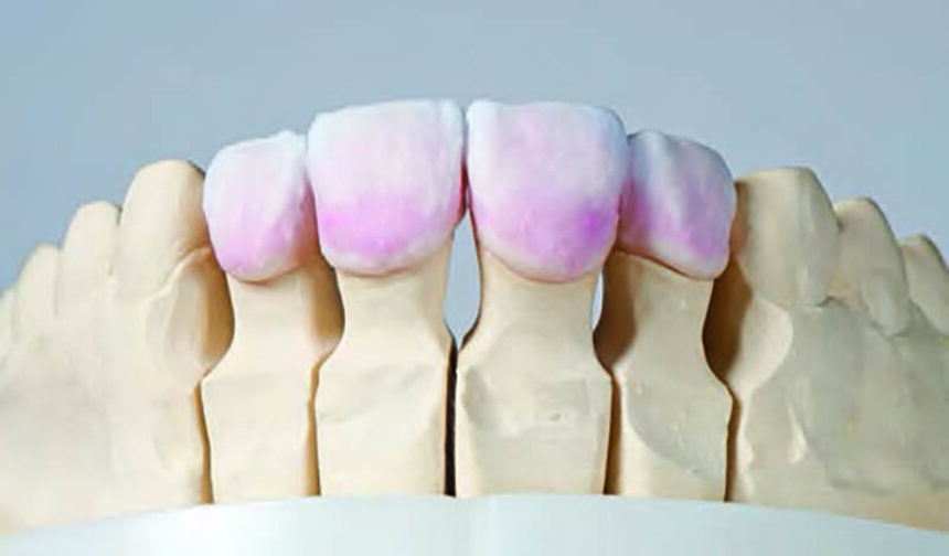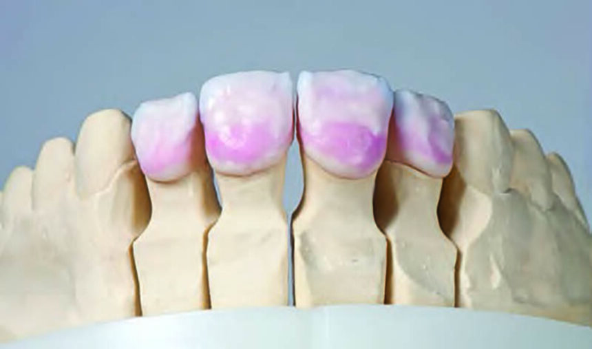 Εικόνα της τελικής κεραμικής διαστρωμάτωσης στις 4 στεφάνες πριν τη δεύτερη όπτηση οδοντίνης.