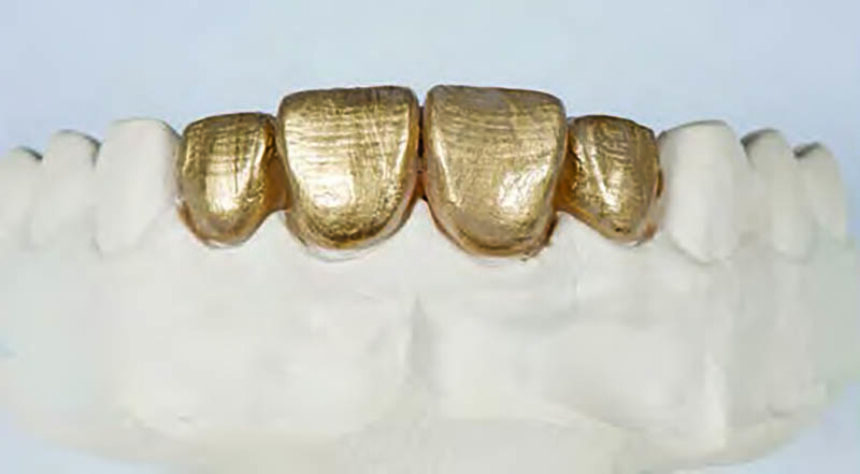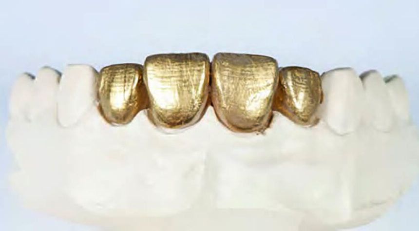 Μετά την τελείωση και στίλβωση, τοποθετήθηκε χρυσόσκονη για οπτικοποίηση των λεπτομερειών της μορφολογίας των στεφανών (εικ. 24 και 25). Πραγματοποιήθηκε όπτηση γλασαρίσματος με Vita Akzent Plus Stains. Με πάστα στίλβωσης και τη χρήση μίας βούρτσας στίλβωσης, επετεύχθη η σωστή στιλπνότητα (εικ. 26).