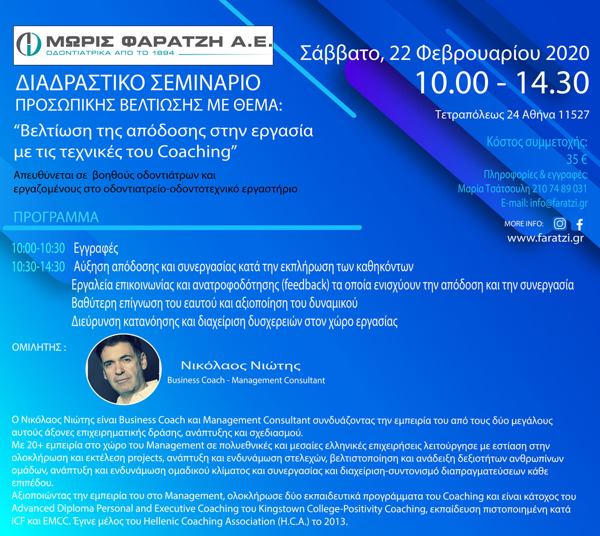 Η εταιρία ΜΩΡΙΣ ΦΑΡΑΤΖΗ Α.Ε., διοργανώνει το Σάββατο 22 Φεβρουαρίου, 10:00-14:30 διαδραστικό σεμινάριο, το οποίο απευθύνεται σε βοηθούς οδοντιάτρων και εργαζόμενους σε οδοντιατρεία και οδοντοτεχνικα εργαστήρια.