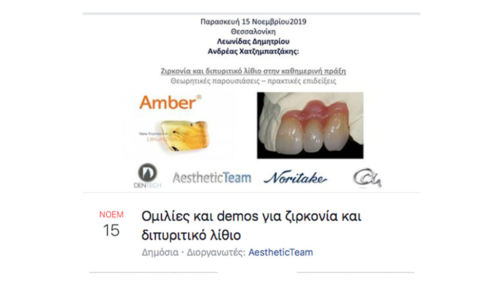 Ο Ανδρέας Χατζημπατζάκης, και ο Λεωνίδας Δημητρίου, Οδοντικοί Τεχνολόγοι– Noritake Kuraray trainers θα εξηγήσουν στην ημερίδα που διοργανώνει η Aesthetic Team στο Egnatia Palace Hotel & Spa, στην Θεσσαλονίκη στις 15 Νοεμβρίου 2019 πως η ζιρκονία και το Διπιρυτικό Λίθιο χρησιμοποιούνται στην καθημερινή κλινική πράξη.