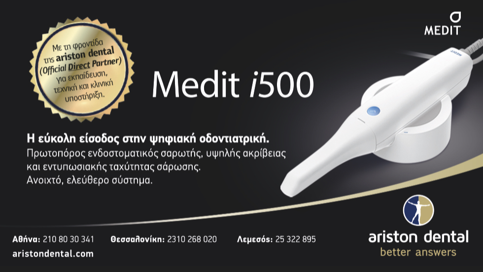 Με την εντυπωσιακή ταχύτητα και το σύστηµα λειτουργίας χωρίς σπρέι σάρωσης, ο Medit i500 επιτρέπει µια οµαλή εµπειρία σάρωσης, περιορίζοντας τους χρόνους διεκπεραίωσης εργασιών και αυξάνoντας την παραγωγικότητα του ιατρείου. Είναι έγχρωµος και παράγει ρεαλιστικές εικόνες υψηλής ανάλυσης και µε ιδιαίτερη απόδοση λεπτοµερειών, επιτρέποντας το διαχωρισµό ανάµεσα στην οδοντική δοµή και το µαλακό ιστό.
