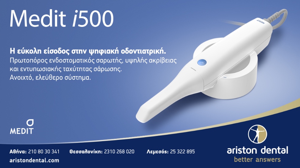 Με χαρά ανακοινώνουμε πως η εταιρεία μας “Ariston Dental – Better Answers” αντιπροσωπεύει στην Ελλάδα και την Κύπρο τον ενδοστοματικό σαρωτή MEDIT i500, για κλινικούς.