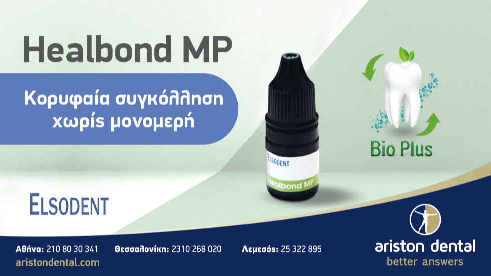 Το Healbond MP είναι αυτοαδροποιούμενος συγκολλητικός παράγοντας 7ης γενιάς, γενικής χρήσης (universal), ελεύθερος από μονομερή TEGDMA, BisGMA, Bisphenol A και HEMA με εξαιρετικές ιδιότητες σε σχέση με τα ανταγωνιστικά του.