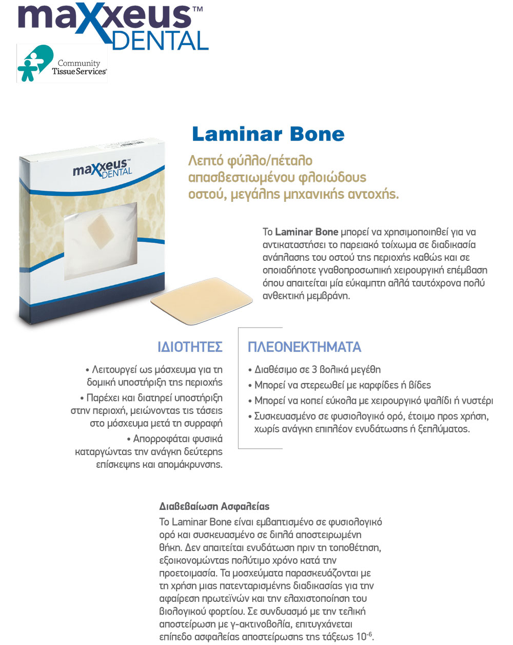 Το Laminar Bone µπορεί να χρησιµοποιηθεί για να αντικαταστήσει το παρειακό τοίχωµα σε διαδικασία ανάπλασης του οστού της περιοχής καθώς και σε οποιαδήποτε γναθοπροσωπική χειρουργική επέµβαση όπου απαιτείται µία εύκαµπτη αλλά ταυτόχρονα πολύ ανθεκτική µεµβράνη.