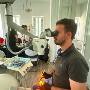 Την τρίτη ημέρα ξεκίνησε ο Δημήτρης Τσανακτσίδης περιγράφοντας τη λειτουργία του μικροσκοπίου. Πλέον ολοένα και περισσότεροι οδοντίατροι και κλινικές στον κόσμο επενδύουν στην αγορά μικροσκοπίων. Το μικροσκόπιο προσφέρει μεγαλύτερη μεγέθυνση από οποιαδήποτε λούπα και καθαρότερη εικόνα λόγω του διαφορετικού τρόπου που το φώς εισέρχεται στον φακό. Επίσης καθιστά τον θεράποντα ικανό να εργαστεί περισσότερη ώρα και πιο ξεκούραστα αφού έχει καλύτερη στάση σώματος κατά την εργασία του. Δόθηκαν διάφορα tips και tricks για την ορθή χρήση του μικροσκοπίου μιας και χρειάζεται προσαρμογή ανάλογα τη διάπλαση και το σωματότυπο του κλινικού. Στη συνέχεια ο Δημήτρης έδειξε όσα παρουσίασε και πρακτικά σε μικροσκόπιο της εταιρείας Zeiss και έδωσε κάποιες ασκήσεις με τις οποίες οι συμμετέχοντες μπορούν να εξασκηθούν στο μικροσκόπιο διότι όπως κάθε τι νέο έχει μια καμπύλη εκμάθησης.