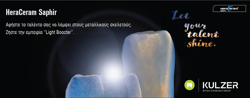 Τα κεραμικά υλικά HeraCeram Saphir βοηθούν τους οδοντικούς τεχνολόγους να φτάσουν σε νέα υψηλά επίπεδα αισθητικής στην επικάλυψη μεταλλικών σκελετών, με την τεχνολογία “Light Booster” και διαθέτουν μια νέα πάστα Opaque, με πολύ εύκολο χειρισμό, επικάλυψη του σκελετού με μία λεπτή στρώση και εξαιρετική υποστήριξη.