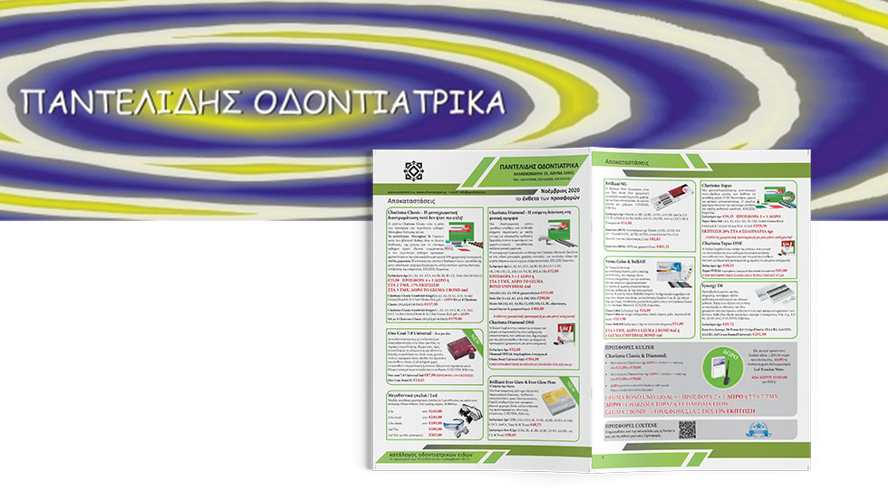 Οι προσφορές δεν σταματούν εδώ. Προσφορές 2+1, 3+1 δώρο σας προτείνει η εταιρία ΠΑΝΤΕΛΙΔΗΣ ΟΔΟΝΤΙΑΤΡΙΚΑ και στα συγκολλητικά, Gluma Bond Universal, Gluma 2 Bond και στα πινελάκια τοποθέτησης. Στον κατάλογο με τις προσφορές θα δείτε αναλυτικά τις τιμές για τα βοηθήματα που χρησιμοποιούνται στις αποκαταστάσεις, όπως άξονες ενδομυλικοί Τristar (Edenta), Aποκαταστάσεις Όψεων Signum Ceramic Bond (Kulzer), Σφήνες διαφανείς, ξύλινες (Κerr Hawe), γυαλιά προστασίας, ανταλλακτικούς κοχλίες για το εργαλείο Super Mat, γωνίες σελυλόιντ για εγγυς και άπω (Directa), αμαλγάματα, εκμαγεία και πολλά ακόμα αναλώσιμα για το οδοντοτεχνικό εργαστήριο σας.