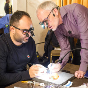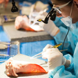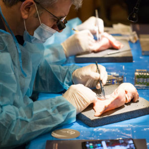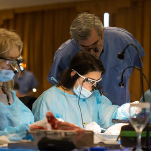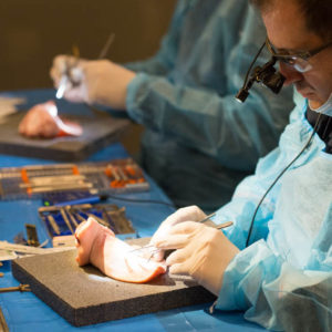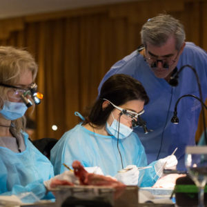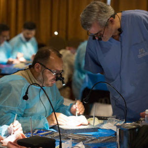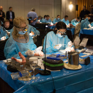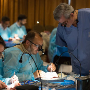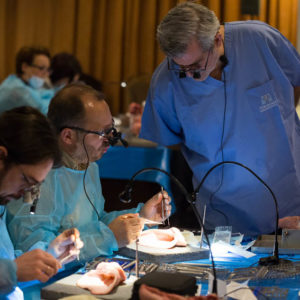 Οι συμμετέχοντες και τις δύο ήμερες μετέφεραν την θεωρία στην πράξη, μέσω ασκήσεων τομών και συρραφών, οι οποίες πραγματοποιήθηκαν σε φρέσκα λαχανικά, γνάθους και αυτιά χοίρων. Επίσης, είχαν την δυνατότητα να γνωρίσουν τον τρόπο εκμάθησης του Swiss Perio Education, αφού μέσω των πρωτοποριακών συσκευών, ο Rino Burkhardt μπορούσε να αξιολογήσει, αλλά και οι ίδιοι να εξελίξουν τεχνικές συρραφής.