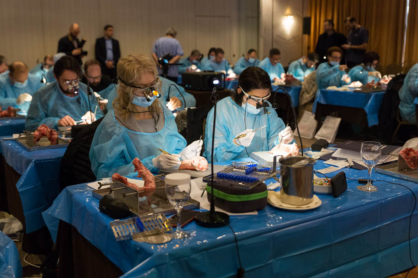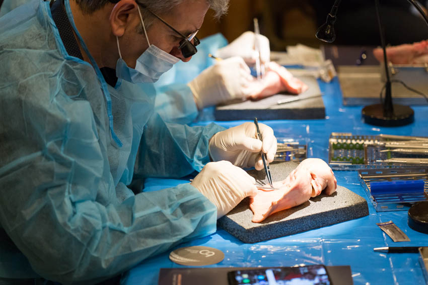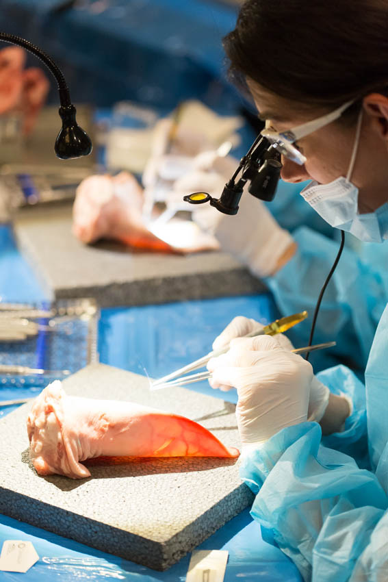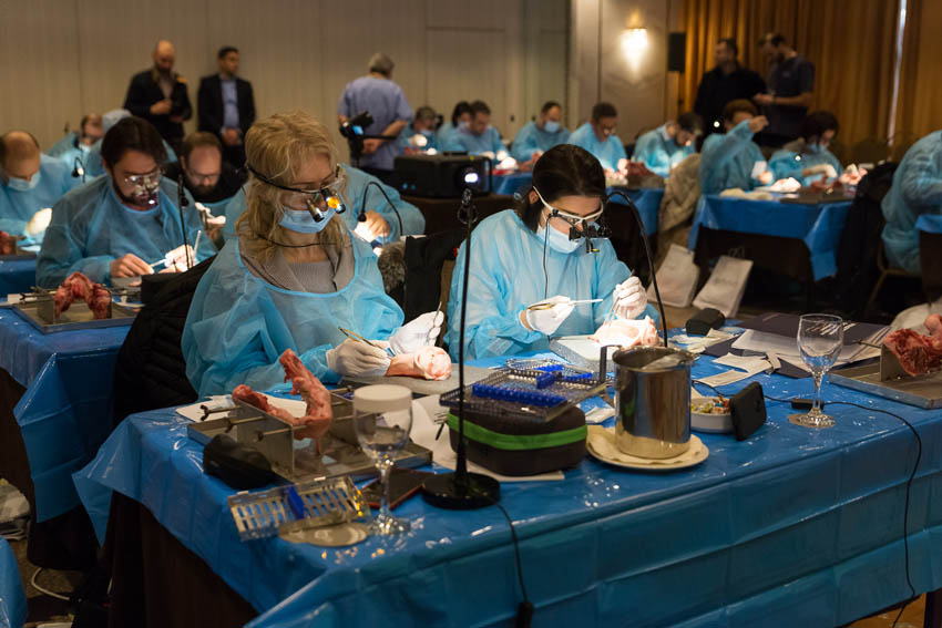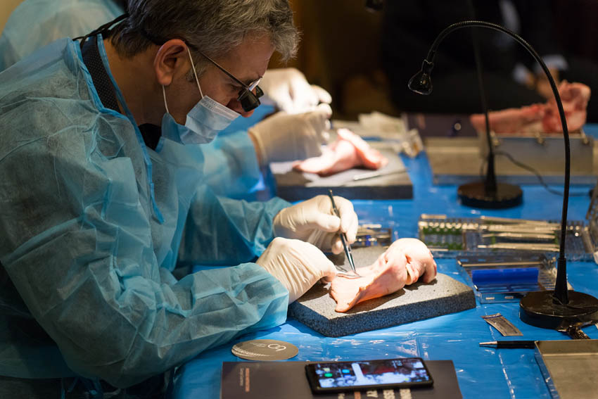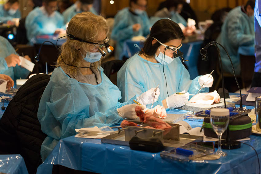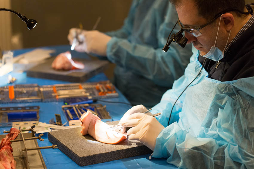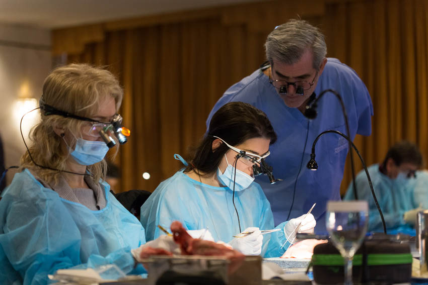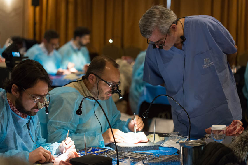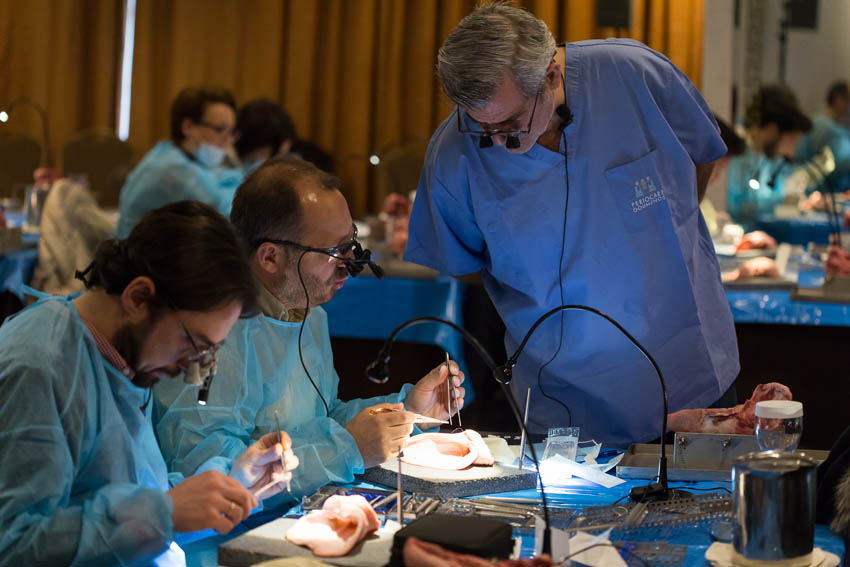 Οι συμμετέχοντες και τις δύο ήμερες μετέφεραν την θεωρία στην πράξη, μέσω ασκήσεων τομών και συρραφών, οι οποίες πραγματοποιήθηκαν σε φρέσκα λαχανικά, γνάθους και αυτιά χοίρων. Επίσης, είχαν την δυνατότητα να γνωρίσουν τον τρόπο εκμάθησης του Swiss Perio Education, αφού μέσω των πρωτοποριακών συσκευών, ο Rino Burkhardt μπορούσε να αξιολογήσει, αλλά και οι ίδιοι να εξελίξουν τεχνικές συρραφής.
