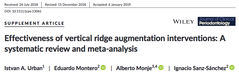 Στο επιστημονικό άρθρο “Effectiveness of vertical ridge augmentation interventions: A systematic review and meta-analysis” των Urban IA, Monje A & Sanz-Sanchez (J Clin Periontolol. 2019;46 (Suppl.21):319-339) γίνεται προσπάθεια να διερευνηθούν τα αποτελέσματα των τεχνικών που εφαρμόζονται προκειμένου να επιτευχθεί vertical ridge augmentation οn clinical bone gain. Στόχος είναι να δωθεί απάντηση στο ερώτημα: