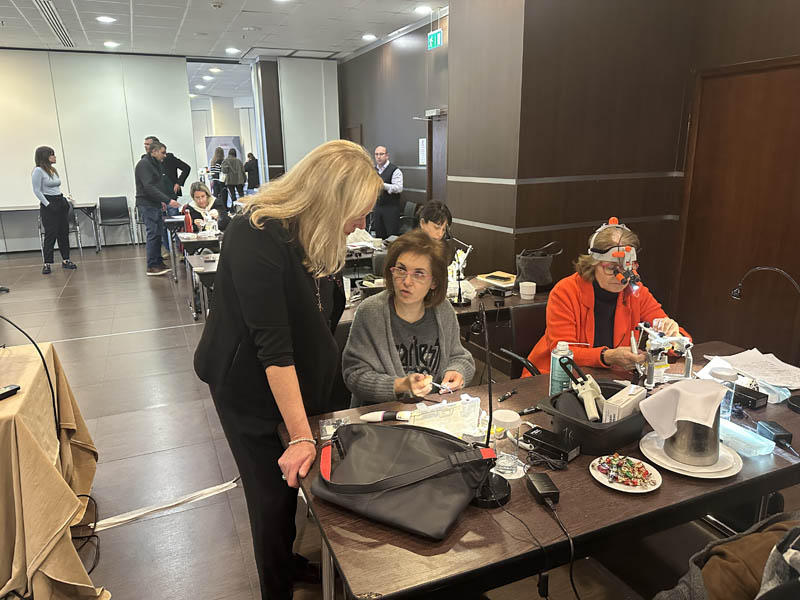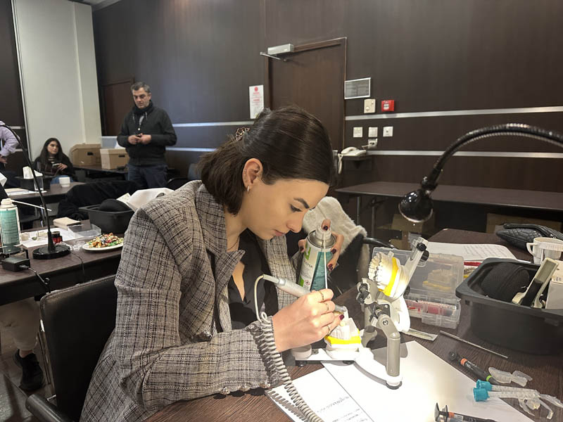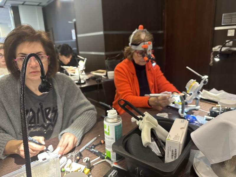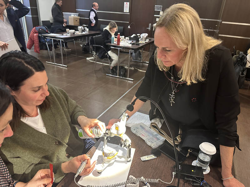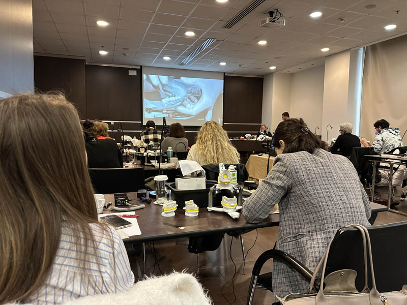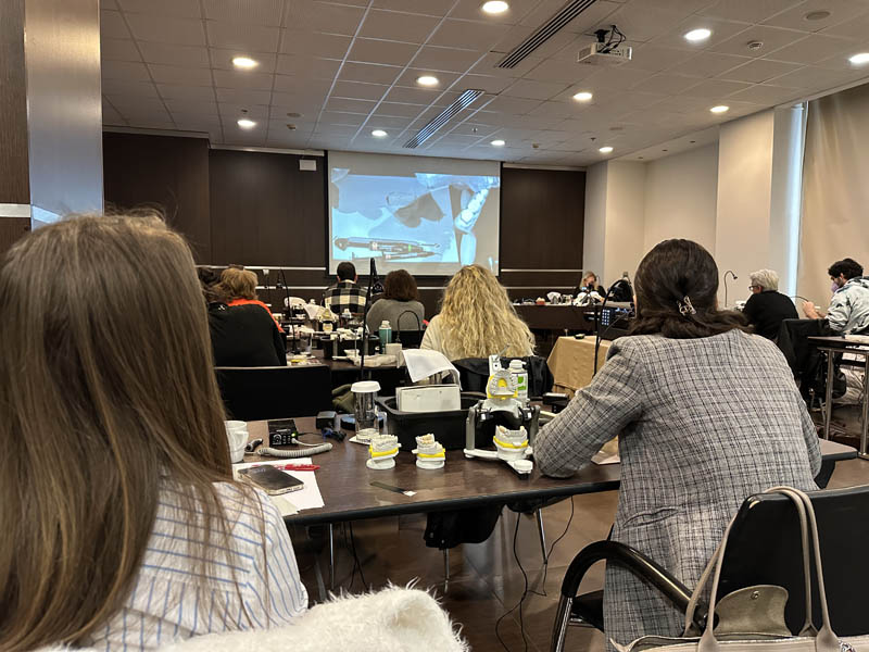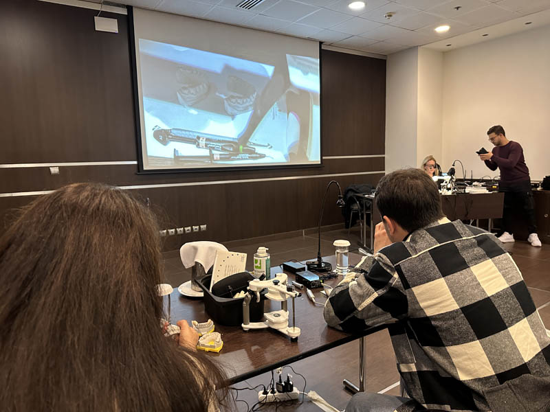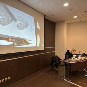 Το πρακτικό μέρος του σεμιναρίου αποτελούταν από δύο σκέλη. Αρχικά έγινε εκλεκτικός τροχισμός σε ημιπροσαρμοζόμενο αρθρωτήρα από την Dr. Ρούσσου εξηγώντας ποιες οδοντικές επαφές χρειάζεται να τροχίζονται και τη λογική πίσω από κάθε απόφαση. Στο 2ο σκέλος έγινε ανύψωση της κάθετης διάστασης σε εκμαγεία βρυγμομανούς ασθενούς με αποτετρημμένα δόντια. Με διαφανή μήτρα σιλικόνης και ρητίνη μεταφέρθηκε το διαγνωστικό κέρωμα στο εκμαγείο με τα αποτετρημμένα δόντια ανυψώνοντας έτσι την κάθετη διάσταση.