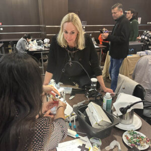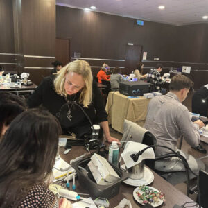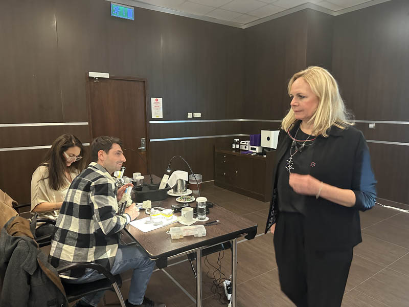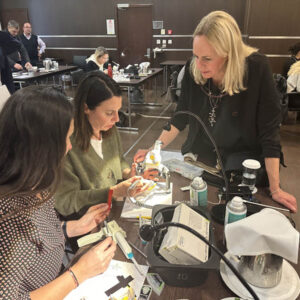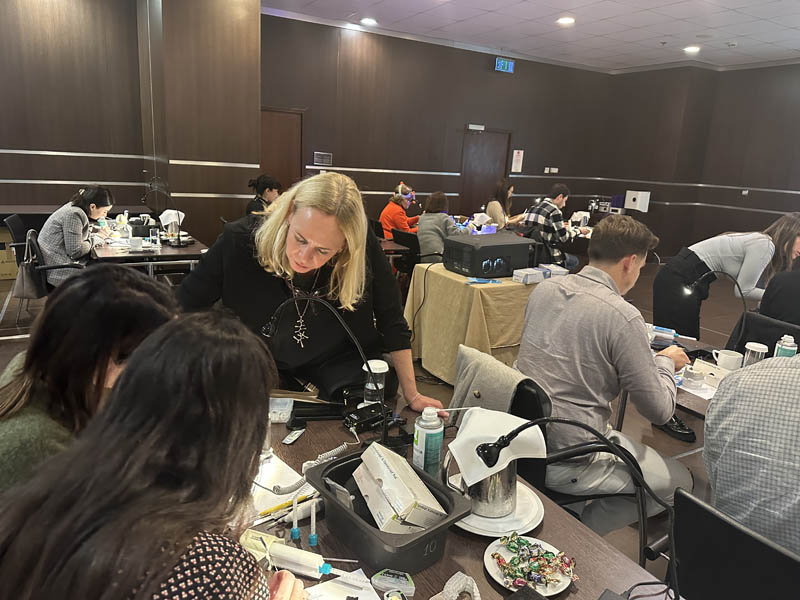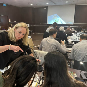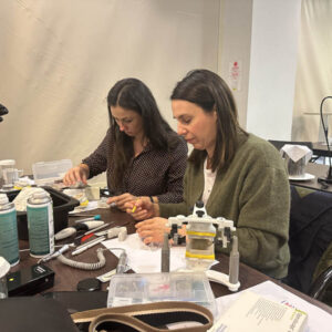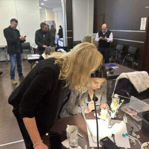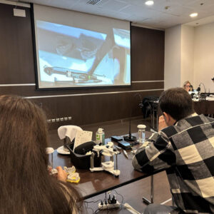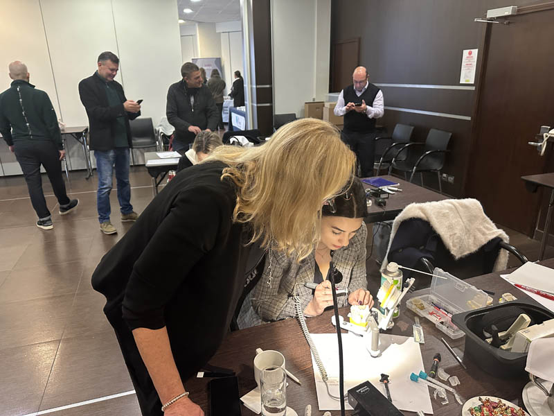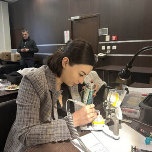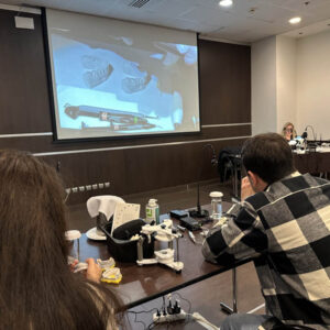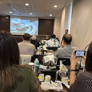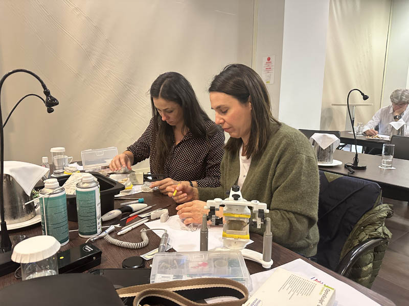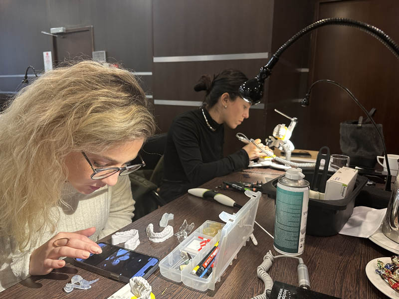 Το πρακτικό μέρος του σεμιναρίου αποτελούταν από δύο σκέλη. Αρχικά έγινε εκλεκτικός τροχισμός σε ημιπροσαρμοζόμενο αρθρωτήρα από την Dr. Ρούσσου εξηγώντας ποιες οδοντικές επαφές χρειάζεται να τροχίζονται και τη λογική πίσω από κάθε απόφαση. Στο 2ο σκέλος έγινε ανύψωση της κάθετης διάστασης σε εκμαγεία βρυγμομανούς ασθενούς με αποτετρημμένα δόντια. Με διαφανή μήτρα σιλικόνης και ρητίνη μεταφέρθηκε το διαγνωστικό κέρωμα στο εκμαγείο με τα αποτετρημμένα δόντια ανυψώνοντας έτσι την κάθετη διάσταση.
