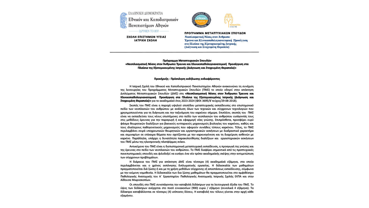 Προκήρυξη για την εισαγωγή νέων φοιτητών για το μεταπτυχιακό ΠΜΣ “Νεοπλασματική Νόσος στον Άνθρωπο” της Ιατρικής Σχολής του ΕΚΠΑ