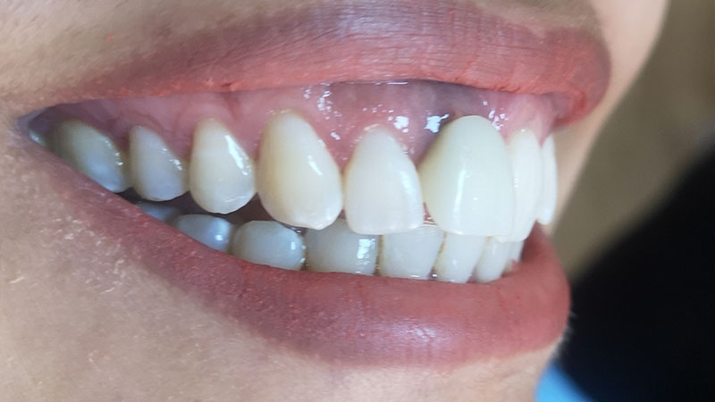 Η ασθενής επέλεξε χρώμα BL1 και ζήτησε διαφανές κοπτικό άκρο (Εικ. 6). Για αυτόν το λόγο, η τεχνική επιλογής ήταν σχεδιασμός της όψης ζιρκονίας με αφαίρεση παρειακά (Εικ. 7) και διαστρωμάτωση πορσελάνης. Επιλέχθηκε η τεχνική όψεων ζιρκονίας για να αποφευχθεί η διαφορά χρώματος μεταξύ της επιεμφυτευματικής στεφάνης και των όψεων. Η καλή αισθητική εμφάνιση και το αρμονικό χαμόγελο επιβεβαιώθηκαν από την τελική φωτογραφία (Εικ. 8).