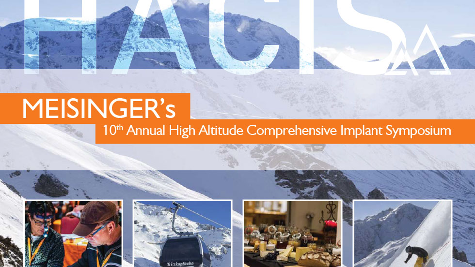 To δέκατο ετήσιο High Altitude Comprehensive Implant Symposium θα πραγματοποιηθεί 28.01.- 01.02.2020 και θα περιλαμβάνει ομιλίες και δυνατότητα συμμετοχής σε 7 πρακτικά σεμινάρια περιορισμένου αριθμού συμμετεχόντων, εκπαιδευτές στα οποία θα είναι παγκοσμίως αναγνωρισμένοι ομιλητές όπως οι Florian Bauer, Fouad Khoury, Alexander Zastera, Giles B. Horrocks, Stavros Pelekanos, Michael S. Block, Istvan Urban, Georg-Hubertus Nentwig, Ashok Sethi, Daniel Cullum, Rawad Samarani.