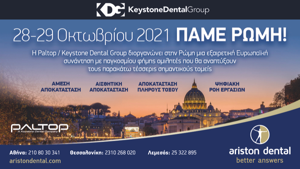 Η Paltop / Keystone Dental Group διοργανώνει στην Ρώμη μια εξαιρετική Ευρωπαϊκή συνάντηση με παγκοσμίου φήμης ομιλητές που θα αναπτύξουν τους παρακάτω τέσσερις σημαντικούς τομείς: Άμεση αποκατάσταση – Αισθητική αποκατάσταση – Αποκατάσταση πλήρους τόξου – Ψηφιακή ροή εργασιών.
