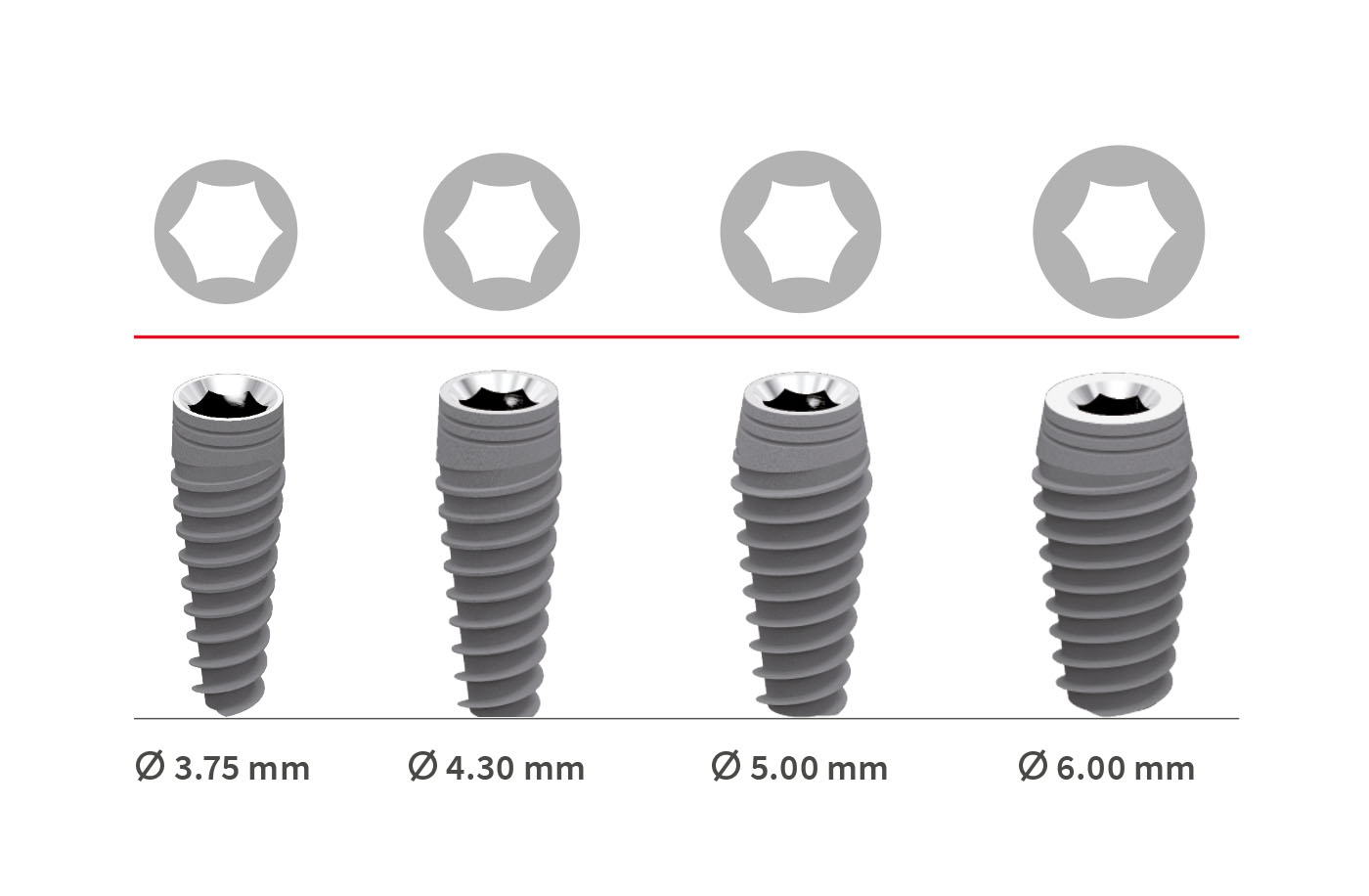 | Ø 3,75mm x 8mm | Ø 4,3mm x 6mm | Ø 5mm x 6mm | Ø 6mm x 6mm |