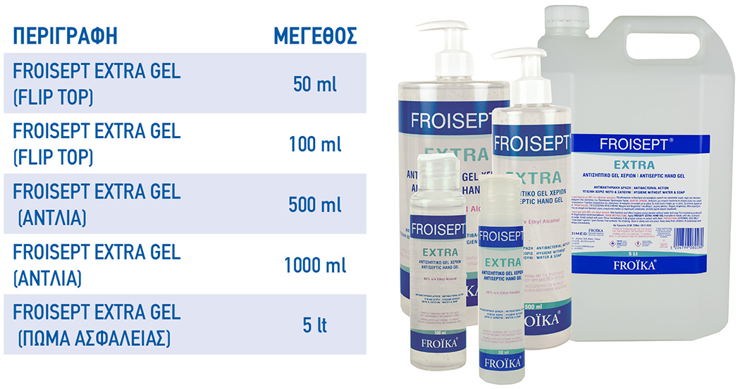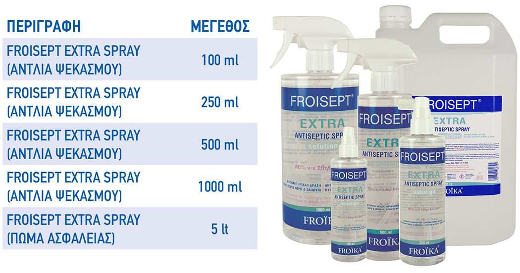 Η εταιρεία FROIKA, σε μια προσπάθεια να βοηθήσει στην πρόληψη και τη μείωση της εξάπλωσης της πανδημίας COVID 19 που πλήττει τον πλανήτη μας, ανέπτυξε τη νέα σειρά αντισηπτικών προϊόντων FROISEPT EXTRA GEL & SPRAY που καλύπτει πλήρως τις ανάγκες για αντισηψία καθ’ όλη τη διάρκεια της ημέρας, στο σπίτι, στον εργασιακό χώρο, στο ιατρείο, σε χώρους αναμονής, σε εξωτερικούς χώρους και όπου απαιτείται αποτελεσματική και άμεση αντισηψία.