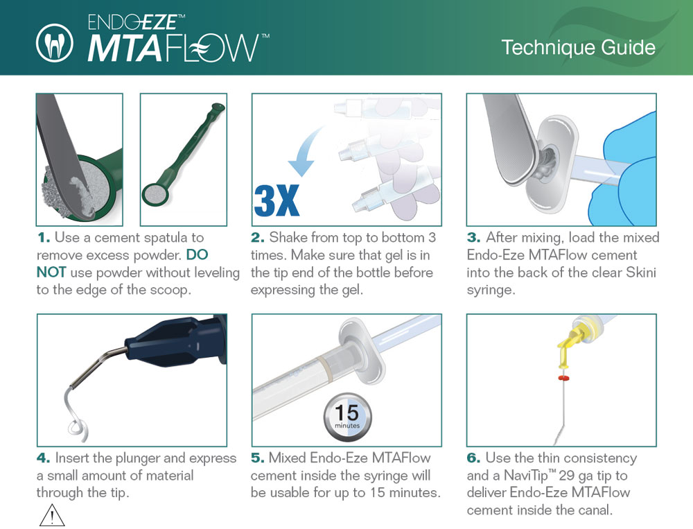 To MTAFlow της Ultradent έχει σχεδιαστεί για να αναμιγνύεται γρήγορα και εύκολα στην κατάλληλη σύσταση για διάφορες χρήσεις. Μπορεί να τοποθετηθεί χρησιμοποιώντας τις σύριγγες και ρύγχη της Ultradent διασφαλίζοντας έτσι την ακριβή και αποτελεσματική τοποθέτηση.