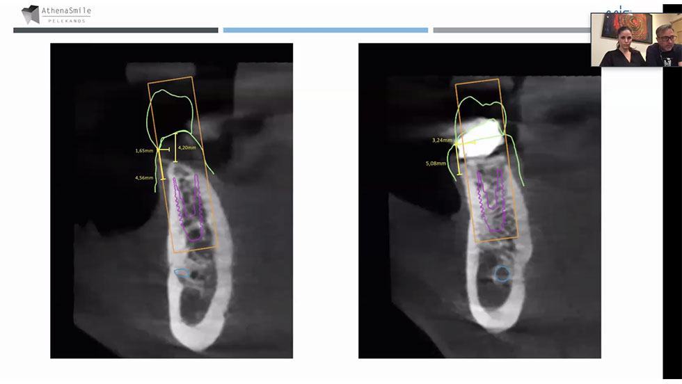 Πριν το live χειρουργείο, στο ξεκίνημα του webinar προηγήθηκε μια παρουσίαση slides με την οποία ο Σταύρος Πελεκάνος εξηγούσε πως θα χειριστεί το περιστατικό σε 2-3 ραντεβού. Στο 1ο ραντεβού υπήρξε η διάγνωση, φωτογραφίες, σκανάρισμα ασθενή και αξονική τομογραφία, όπου διαπιστώθηκε ότι έχουμε δόντι με κακή πρόγνωση για αυτό και θα πρέπει να βγει. “Χρειαζόμαστε οστό στο μεσοφατνίο γιατί εκεί θα τοποθετηθεί το εμφύτευμα” είπε ο κ. Πελεκάνος και τόνισε πως όταν κάνουμε τοποθέτηση σε γομφίο είναι σημαντικό να δούμε πόσο σταθερό είναι το κόκκαλο.